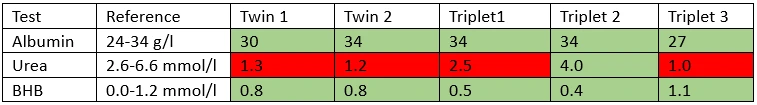 Albumin assess long-term protein intakes, this flock has had good protein intake up until recently. Urea reflects short-term protein intake, as four out of the ewes are low in urea, the protein level of the diet needs addressing so that colostrum production isn’t affected.