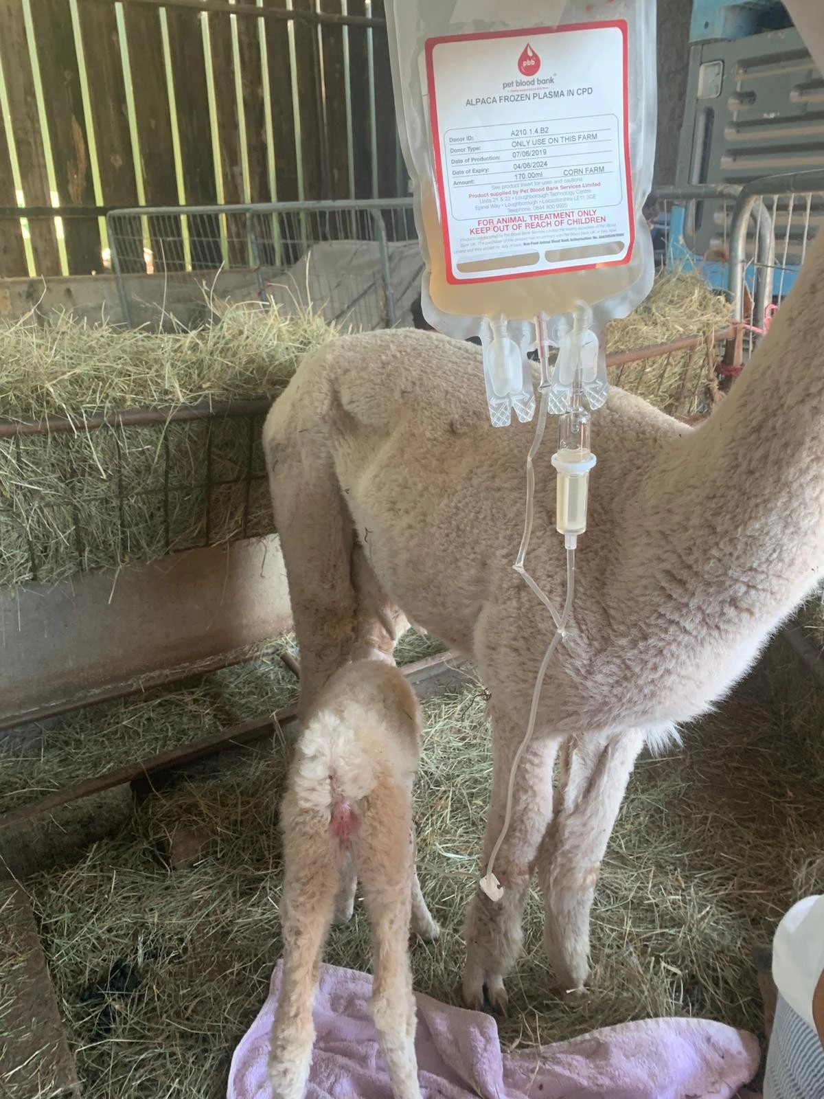 A plasma transfusion can be a life changing treatment for sick cria and occasionally adults. Plasma is the portion of the blood which contains antibodies and our vets can transfuse this directly into the bloodstream of the cria. This boosts the crias antibody levels if they are low (for example following a difficult birth, the dam has little colostrum or the cria has not taken enough colostrum in the first 24 hours of life) or if they are fighting a severe infection such as septicaemia.